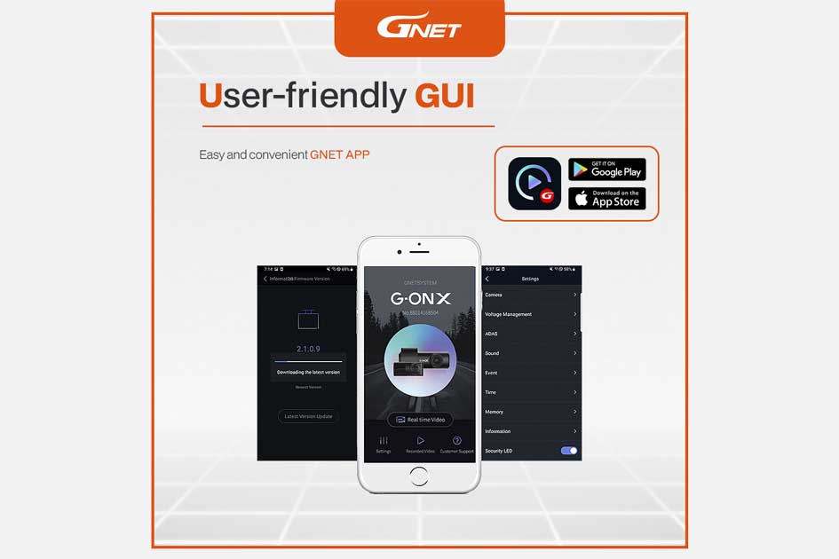 Smartphone Link via Wi-Fi - G-NET APP 1. User-Focused Firmware Upgrade After accessing the firmware configuration through the APP, the latest firmware can be automatically searched for and downloaded. 2. All The features You Need At Once! Easy and convenient GNET APP You can easily set up device registration, real-time video setup, recorded video list, and customer support through the mail screen. 3. Customised Configuration By APP Using the Smartphone APP, you can upgrade the firmware and play video as well as configure various settings.