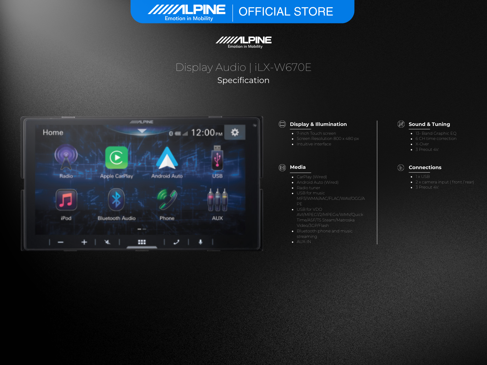 The iLX-W670 boasts a vibrant 7-inch double-DIN touchscreen display with an easy-to-use interface to ensure seamless integration into your vehicle’s dashboard. Whether you’re navigating, selecting your favourite tunes, or engaging with apps, the intuitive interface makes every interaction simple and quick.