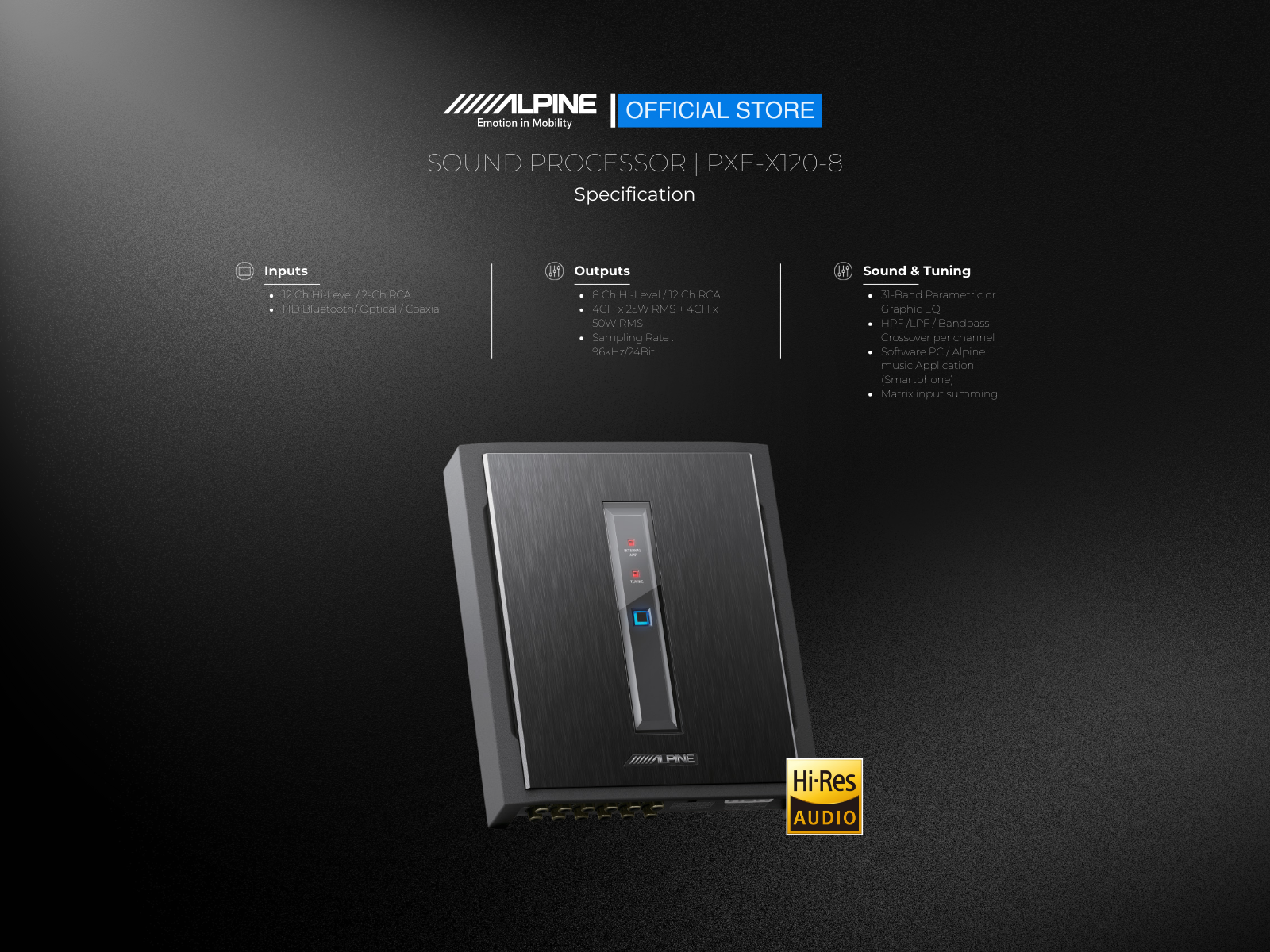 Experience the impressive power and exceptional performance of the Alpine Next-Gen Digital Sound Processor. Elevate your audio with the PXE-X120-8, delivering powerful and precise sound that harmonises with your music, enriching every note and beat.