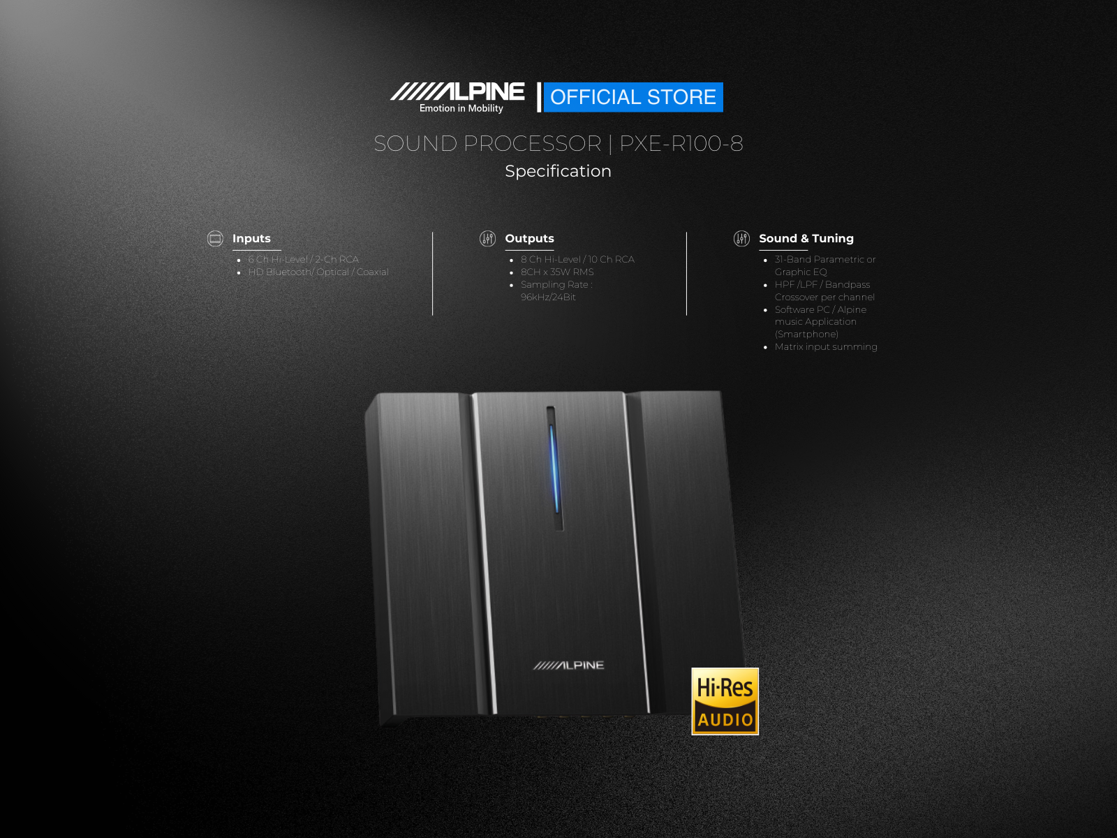 Experience the impressive power and exceptional performance of the Alpine Next-Gen Digital Sound Processor. Elevate your audio with the PXE-R100-8, delivering powerful and precise sound that harmonises with your music, enriching every note and beat.