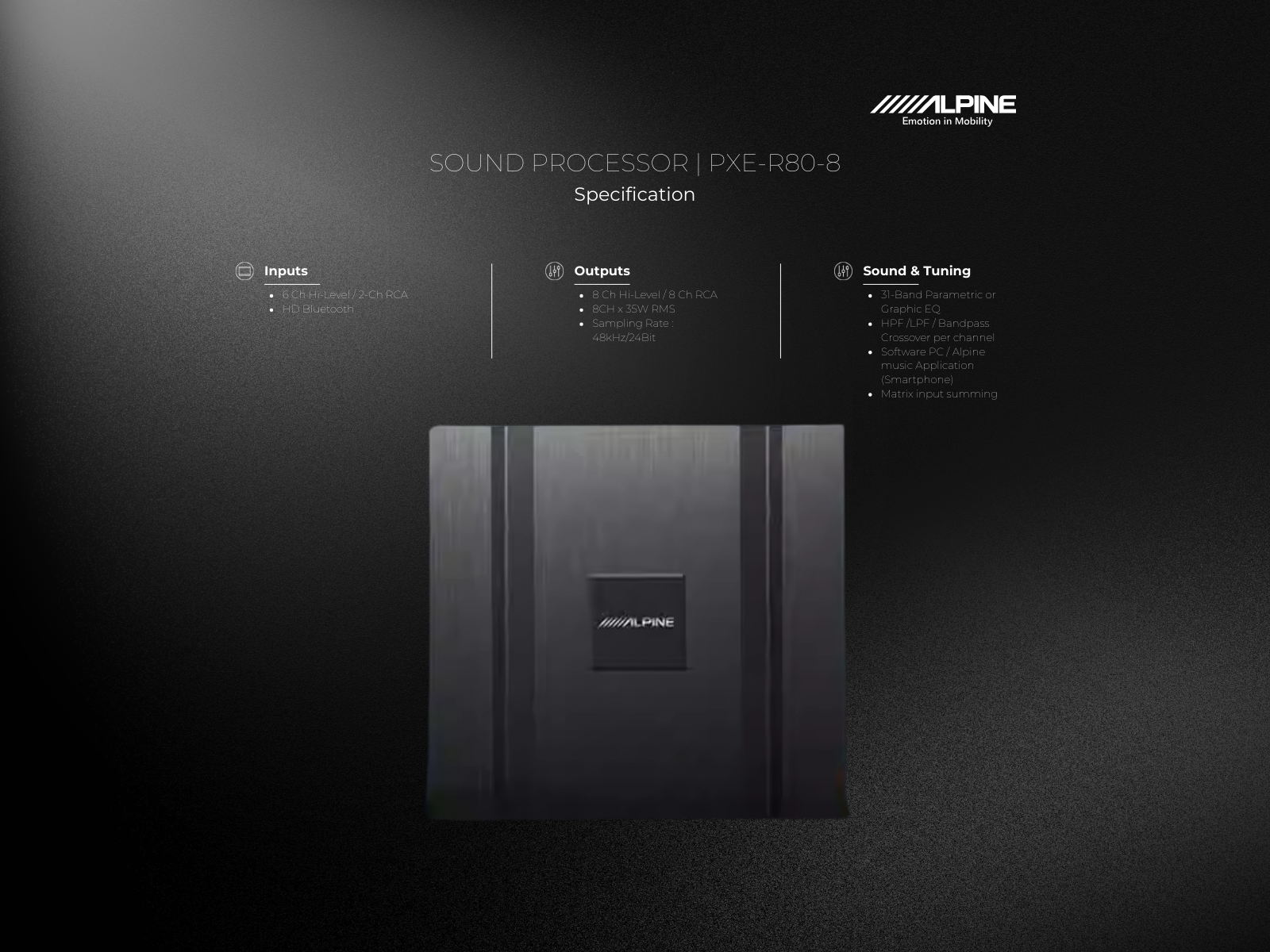 Experience the impressive power and exceptional performance of the Alpine Next-Gen Digital Sound Processor. Elevate your audio with the PXE-R80-8, delivering powerful and precise sound that harmonises with your music, enriching every note and beat.