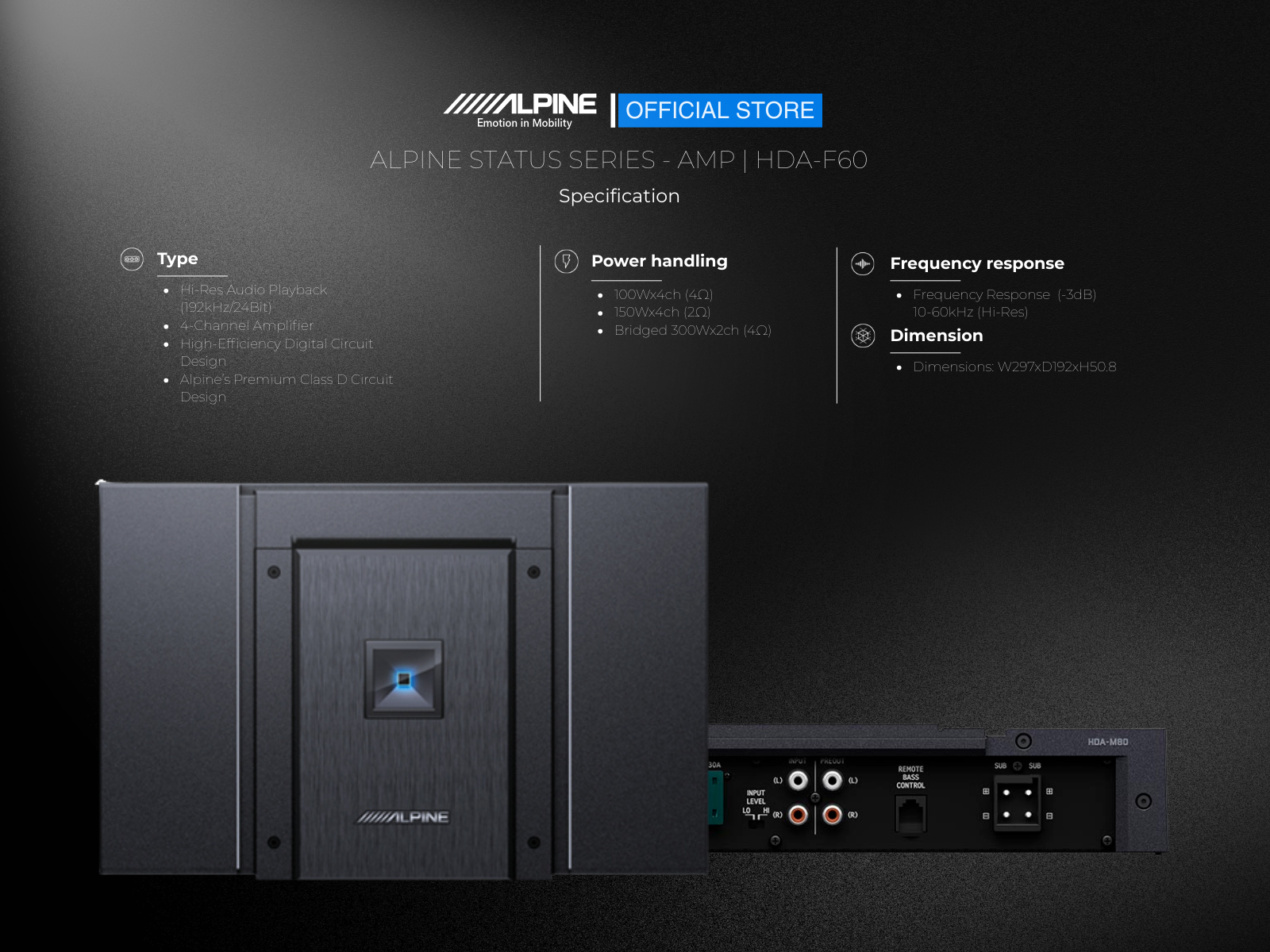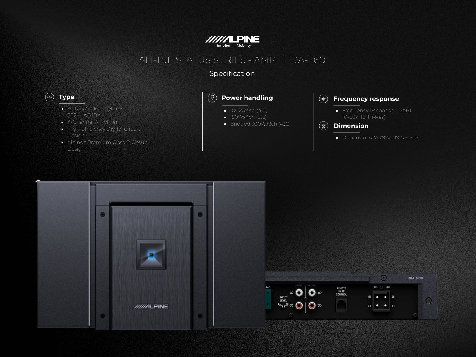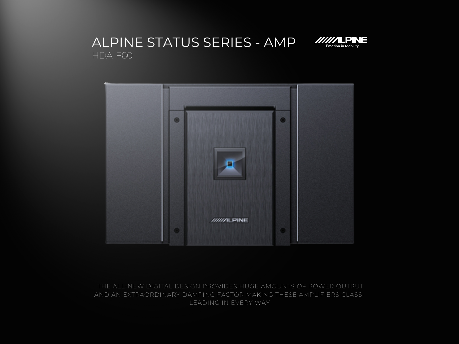 The HDA-F60 Hi-Res Audio certified 4-channel amplifier redefines the industry benchmark in sound performance, delivering true high-resolution sound reproduction. The all-new digital design provides huge amounts of power output and an extraordinary damping factor, making these amplifiers class-leading in every way. With performance at the highest standard, the HDA-F60 has a frequency response of 10-60kHz and a >500 dampening factor to deliver high power output with precision, as well as a superlative high-definition sound experience.
