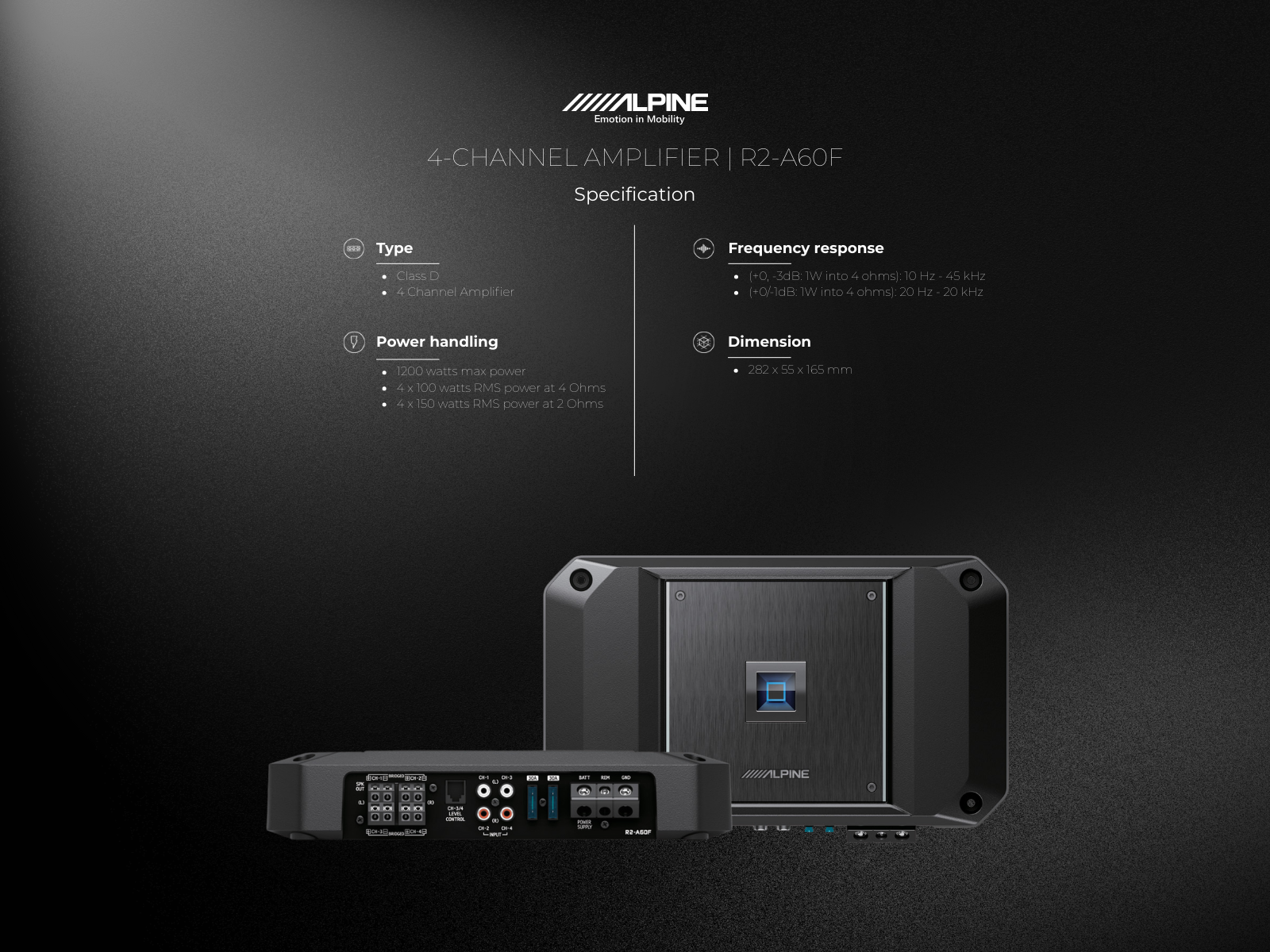 - 4 x 150 watts RMS power at 2 Ohms