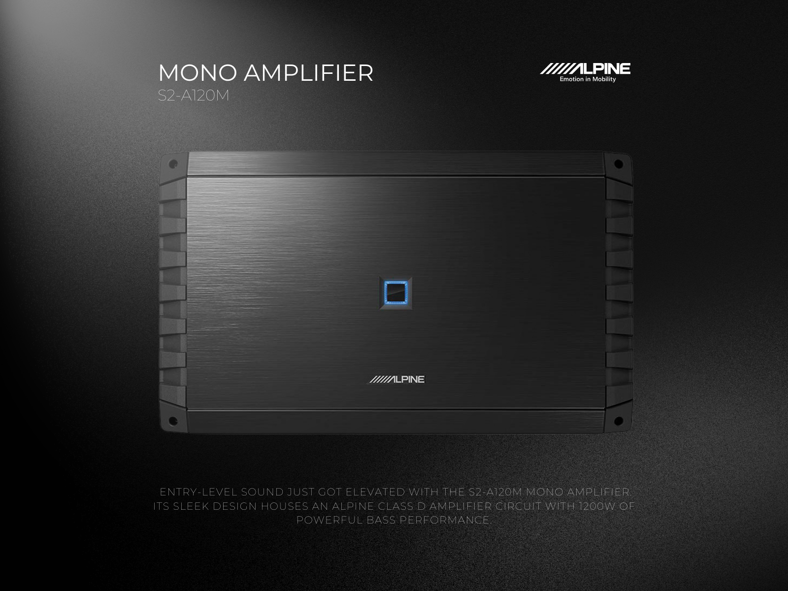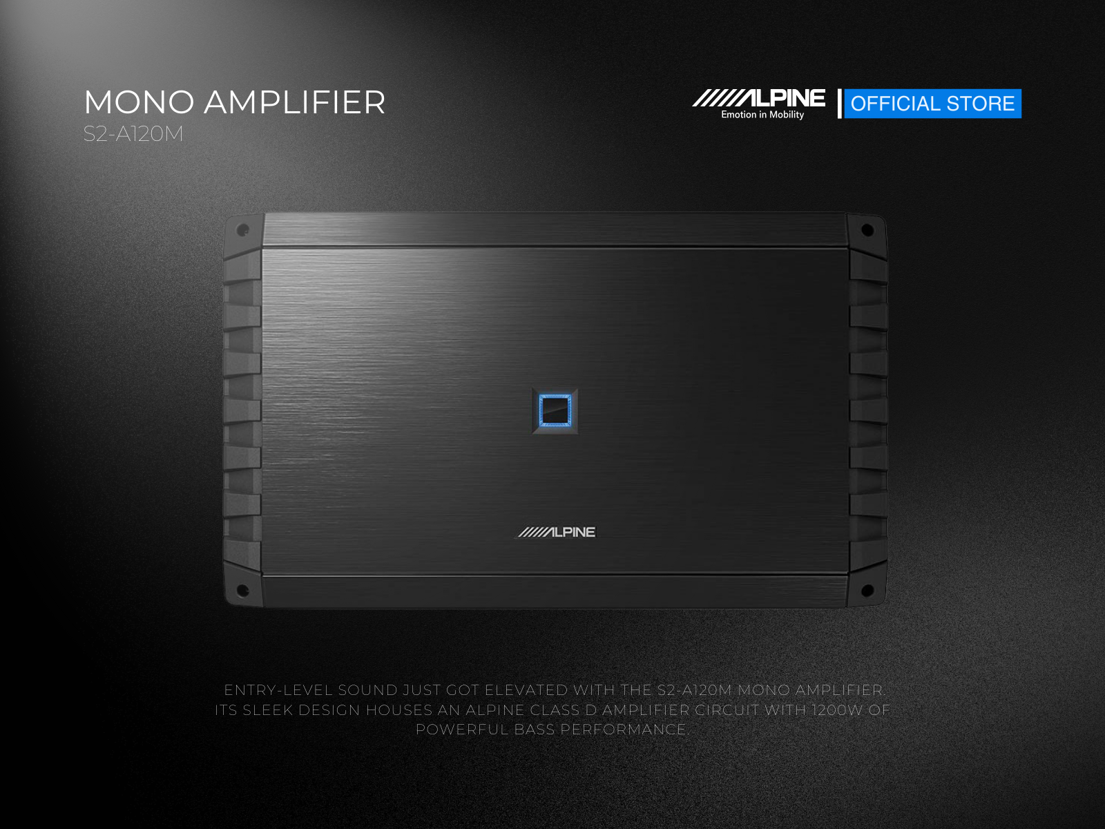 Entry-level sound just got elevated with the S2-A120M Mono Amplifier. Its sleek design houses an Alpine Class D Amplifier Circuit with 1200W of powerful bass performance.