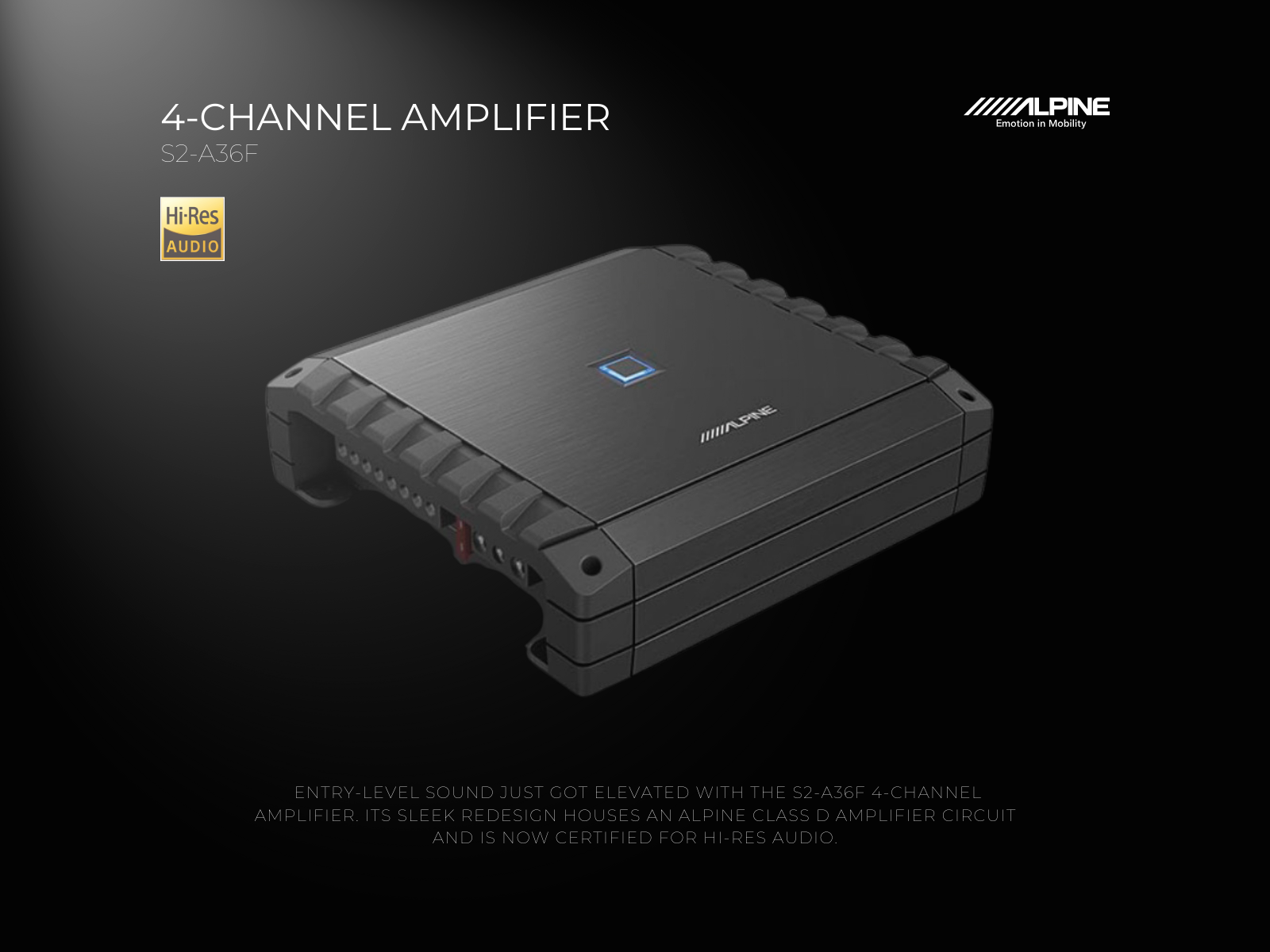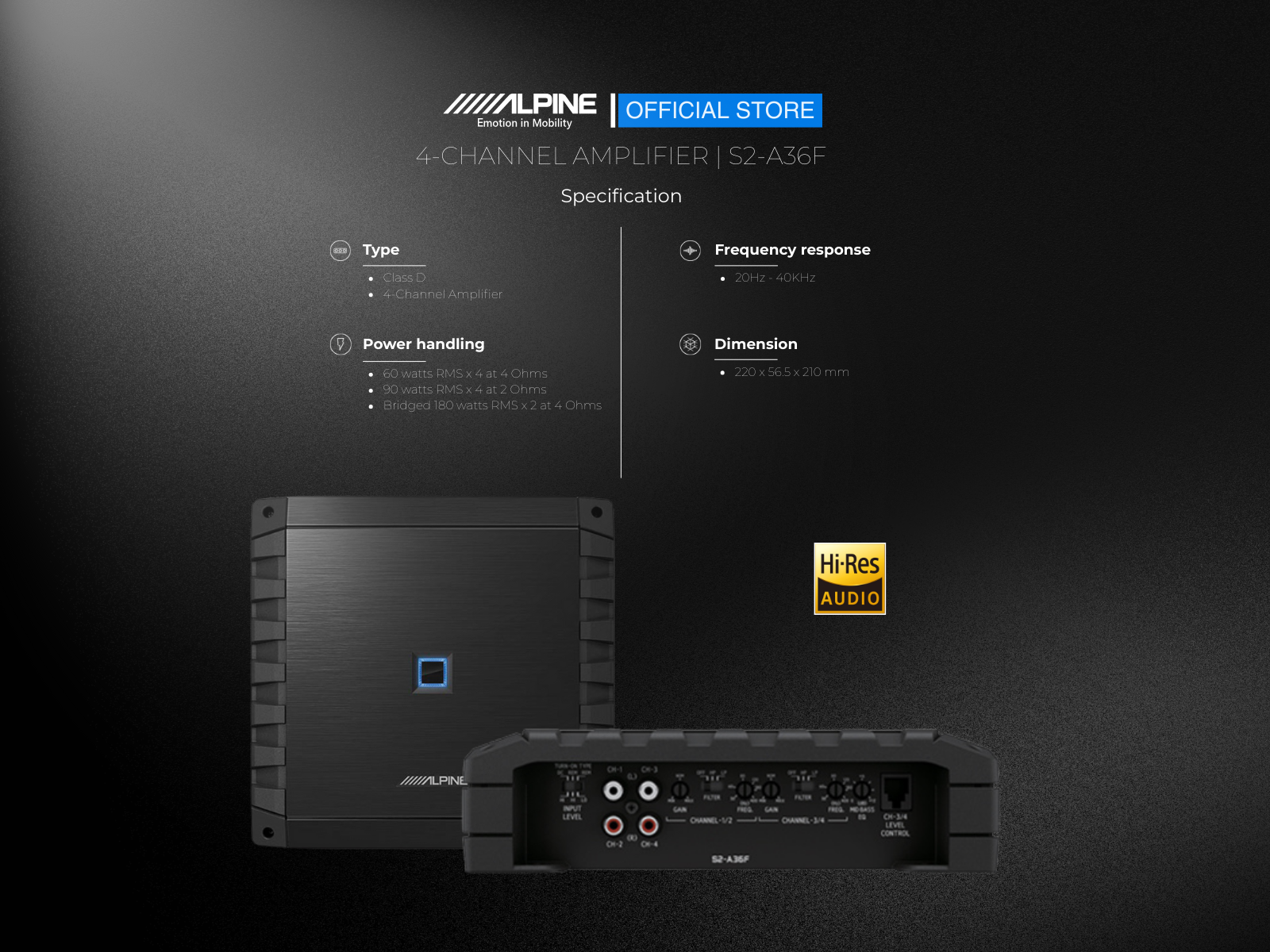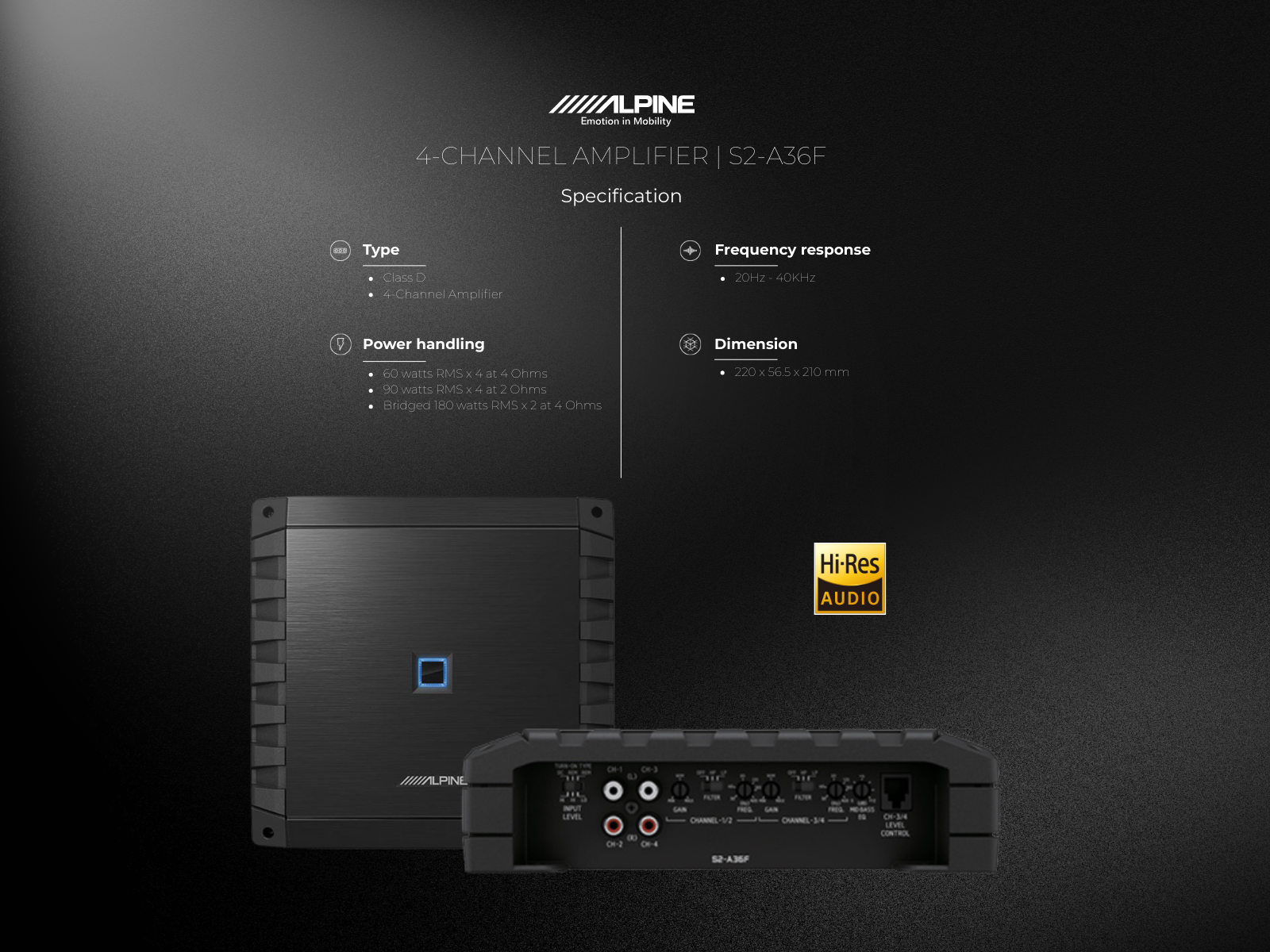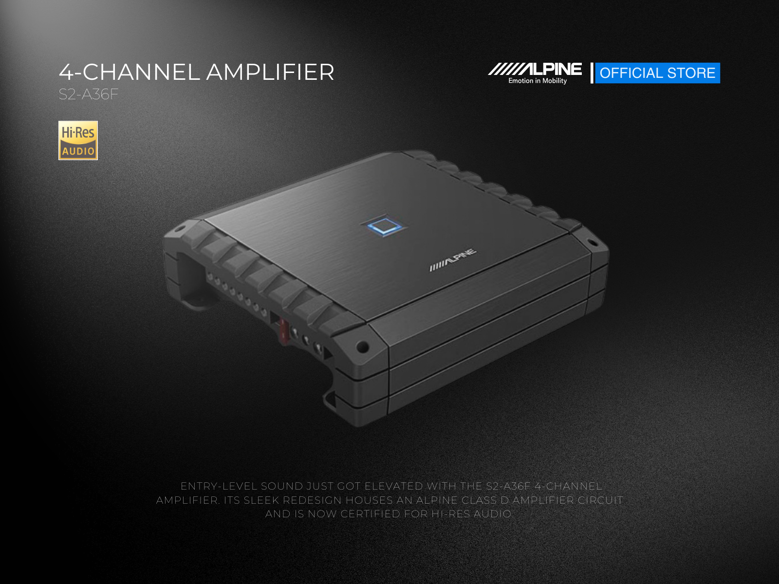 - Hi-res Audio - The Next-Gen Alpine S-Series S2-A36F 4-Channel Amplifier is Hi-Res Audio Certified and able to reproduce up to 40kHz frequency response. This ultra-wide bandwidth, coupled with the elevated S-Series design, brings out a new benchmark for entry-level performance and price.