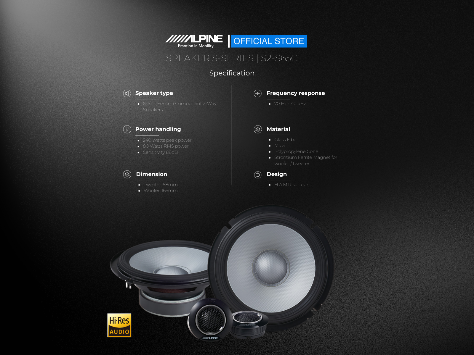 Experience the rich detail and sonic excellence of Alpine’s next-generation S-Series loudspeakers — now featuring Hi-Res Audio for the first time. The S-Series continues to establish the benchmark in sound quality and value by producing impressively detailed loudspeakers that accurately represent true studio-level Hi-Resolution audio faithfully across the entire frequency bandwidth.