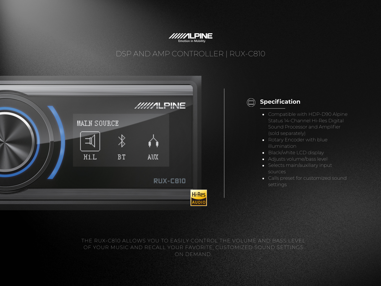 The RUX-C810 is required for stand-alone operation of the HDP-D90 (if the HDS-990 is not used). It allows basic operation of the DSP amplifier, such as volume control, source selection, preset selection etc.