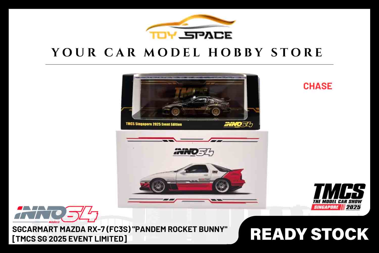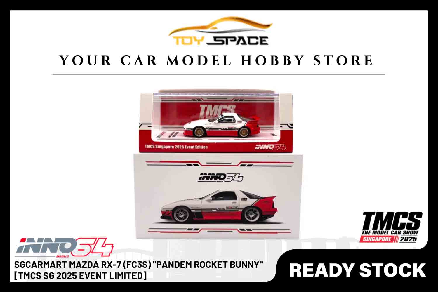 This is a limited-edition INNO64 1:64 die-cast model of the Mazda RX-7 (FC3S), released in collaboration with SGCARMART exclusively for The Model Car Show (TMCS) Singapore 2025. The car features the iconic Pandem Rocket Bunny wide-body styling, complete with flared fenders, a large rear wing, and aggressive front aero.
