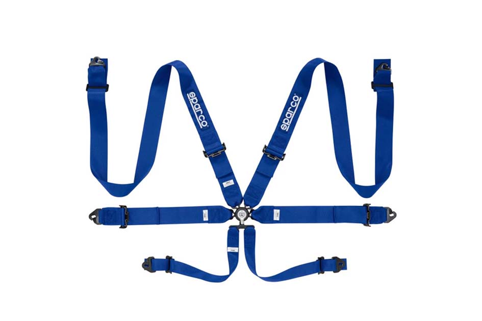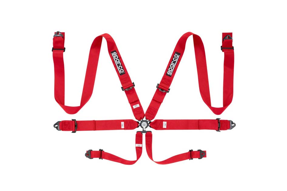 This SPARCO 6-point race/rally harness is fitted with steel adjusters on both the 3” shoulder and 3” lap belts, whilst 2” straps secure the two lower points via the T-bar crutch strap.
