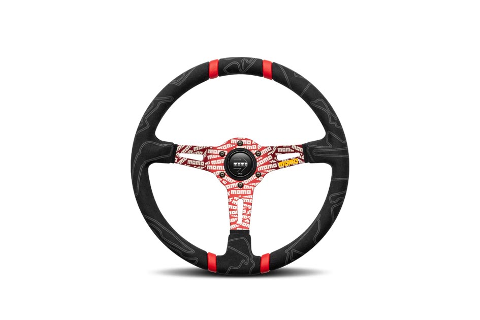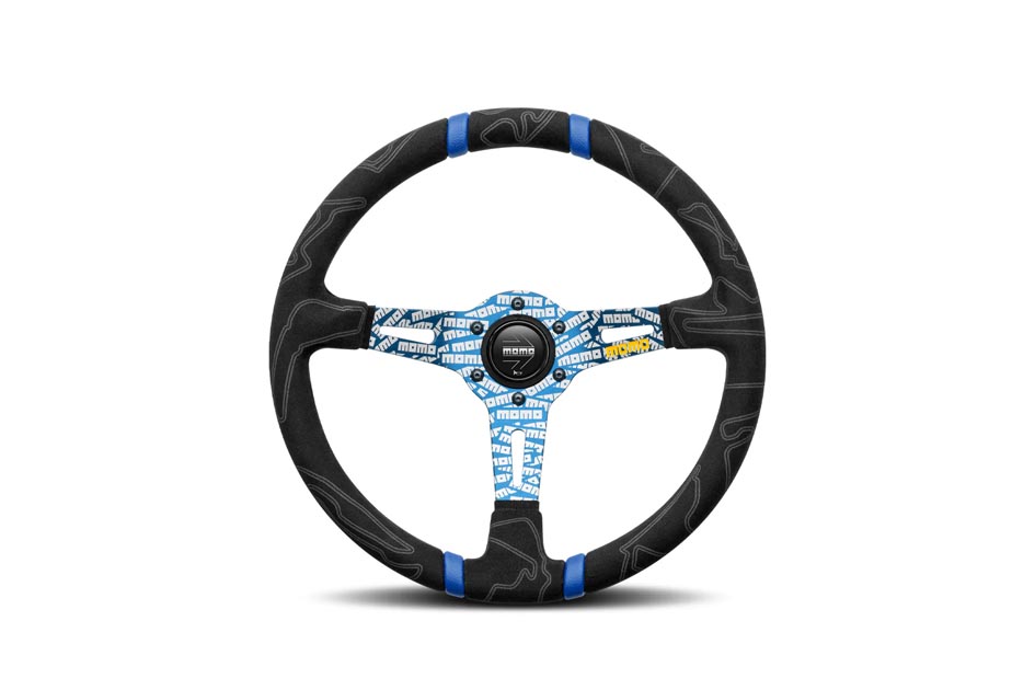The MOMO Ultra steering wheel features cut-out spokes available in either black, blue or red with a sticker-bomb effect of the MOMO logo and an embossed yellow MOMO logo with a contrasting MOMO Italy horn button in black.