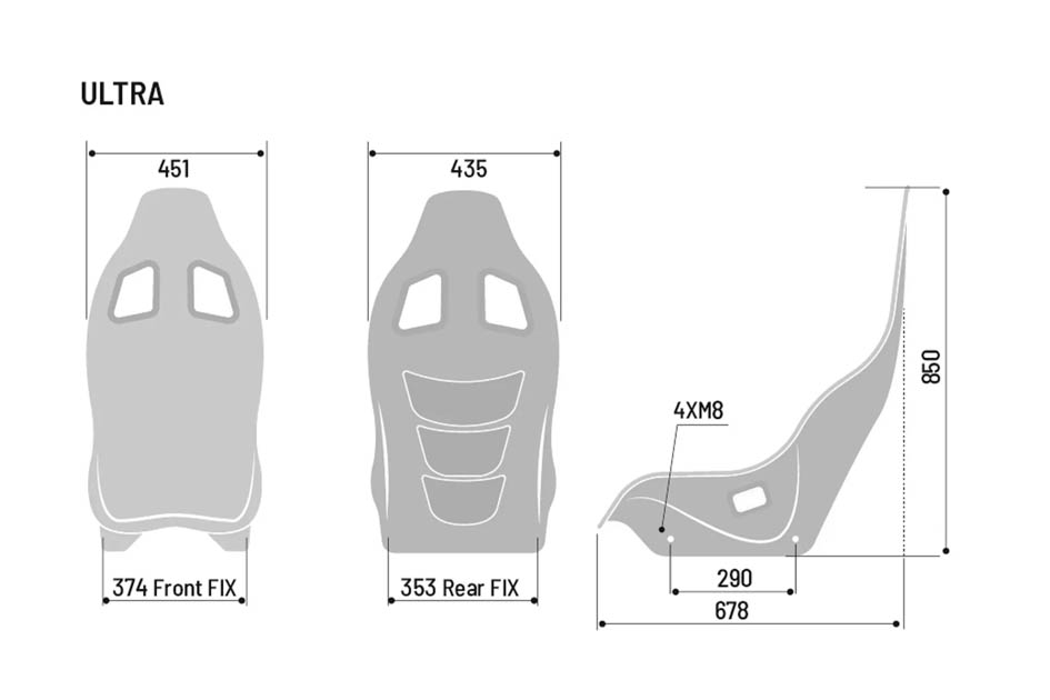 - Deep side bolsters and sculpted base provide excellent lateral support and side impact protection